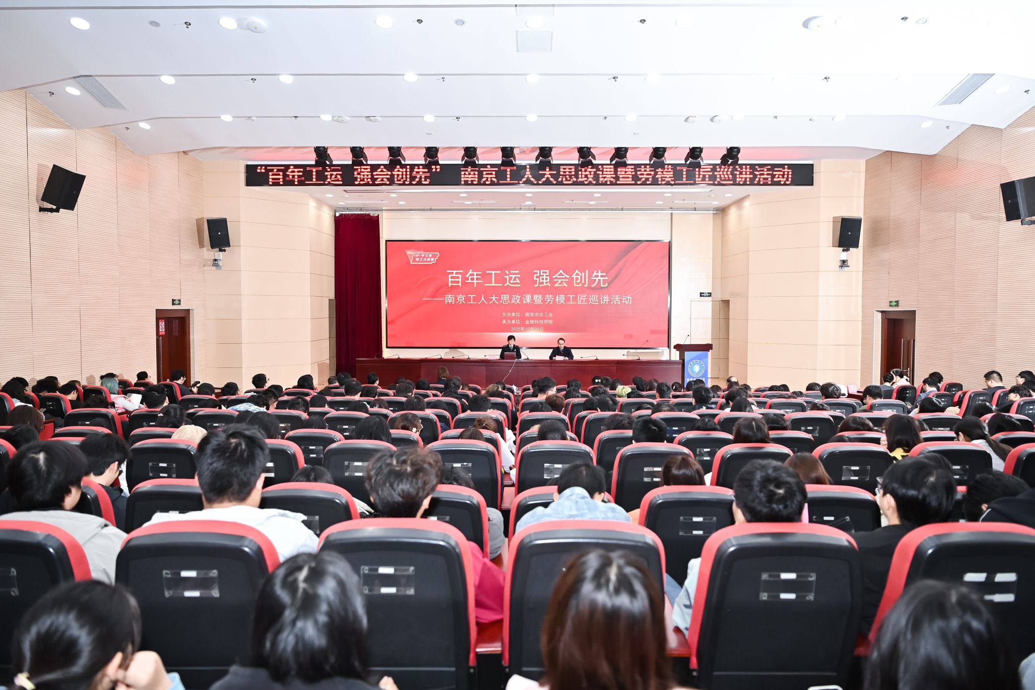 10月20日下午,南京市总工会“百年工运 强会创先”2025年南京工人“大思政课”暨劳模工匠巡讲活动走进我校江宁校区。陈炯、林榕、王利等3位劳动模范以“真人、真事、真情”的鲜活案例,从不同维度诠释了劳模精神、劳动精神、工匠精神,为师生带来一场生动深刻的“思政课堂”。活动由校党委副书记单晓峰主持,200多名师生聆听劳模事迹,汲取奋进力量。